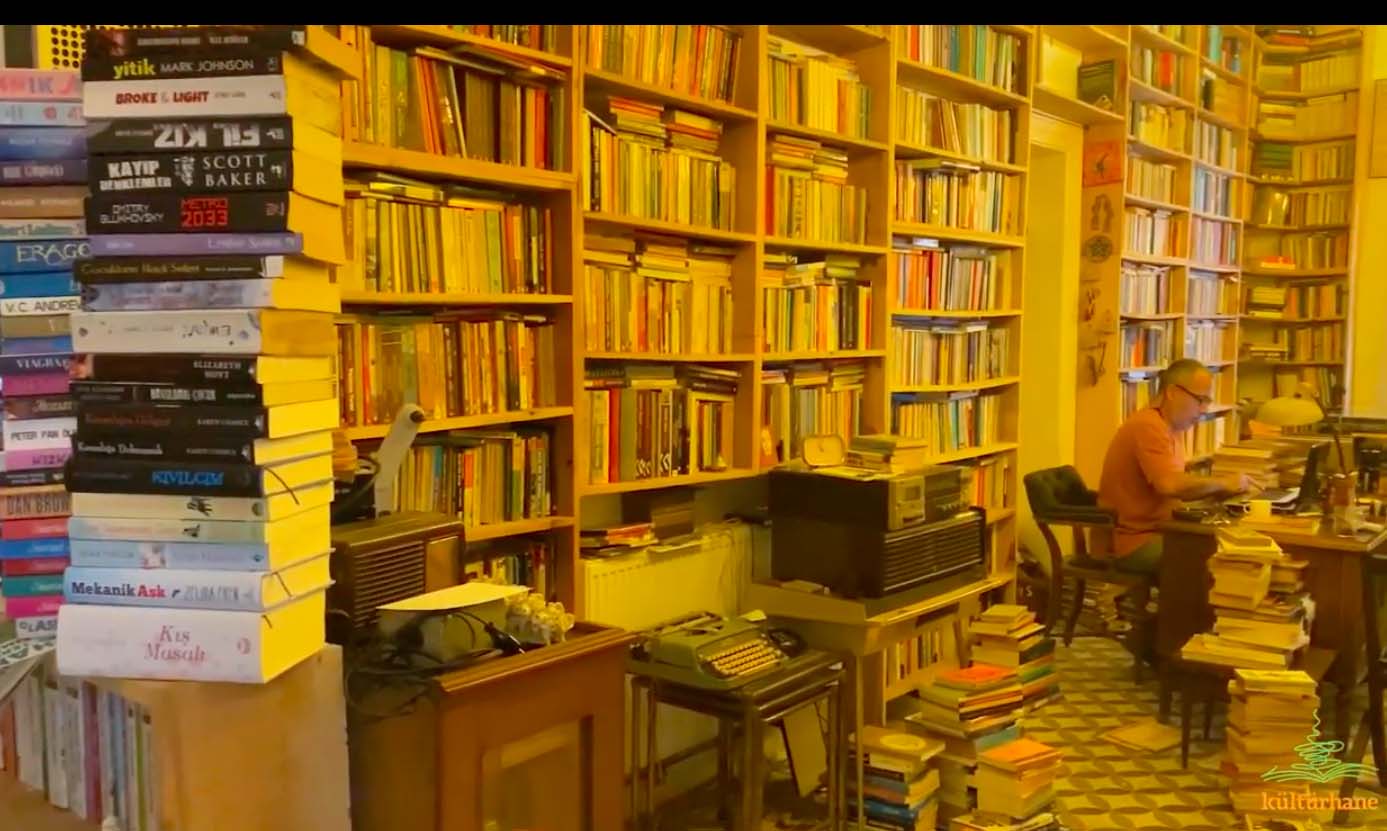 Mersin’in eski merkezi Çamlıbel Mahallesi’nde, portakal ağaçlarıyla bezeli bir sokakta, tam da mevkiinin ruhuna uygun yüksek tavanlı, üç odalı, duvarlarındaki binlerce kitapla insanı sonsuz bir seyre çıkaran, atmosferiyle sarıp sarmalayan bir mekân burası.